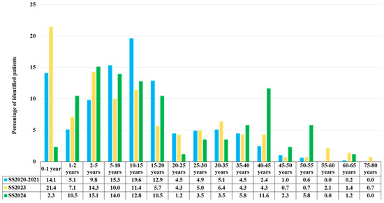 We next analyzed the patients’ age at the time of application for diagnostics in all selective screening groups. For 490 patients with 5q SMA identified through selective screening in 2020–2021 (Selective Screening Group 1, SS2020–2021), the median age was 11.4 years. The median age for 140 patients in Selective Screening Group 2 (SS2023) was 7.5 years, while for 86 patients in Selective Screening Group 3 (SS2024), the median age was 13 years.