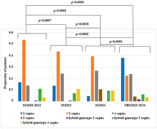 Comparing the NBS2023–2024 group with the SS2020–2021 and SS2023 groups for patients with the genotype carrying three copies of SMN2 exon 7 (p < 0.0001), the proportion of patients with three copies of SMN2 was lower in the neonatal screening group, which is explained by the higher representation of more severely affected patients carrying two copies identified during neonatal screening.