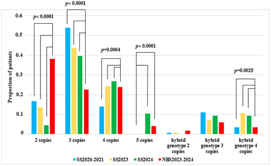 Statistically significant differences were detected when comparing the first selective screening group (Group 1, SS2020–2021) with both the third selective screening group (Group 3, SS2024) and the newborn screening group (NBS2023–2024) for the genotype with five copies of exon 7 of the SMN2 gene (p < 0.0001). In the 2024 selective screening group, an increased proportion of patients with five copies was observed. This may be explained by a higher rate of individuals with a “mild” phenotype seeking medical evaluation due to increased public awareness regarding 5q SMA following the implementation of neonatal screening.