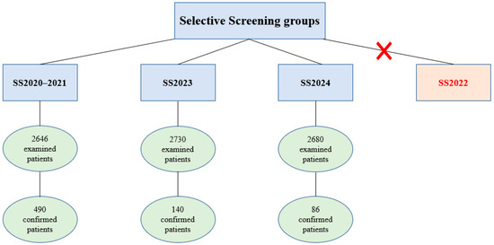 The block diagram of the three selective screening groups included in the study: Selective Screening Prior to Nationwide Screening Projects, SS2020–2021, Selective Screening During NBS in 2023, SS2023, Selective Screening During NBS in 2024, SS2024; and the selective screening group excluded from the study—SS2022.