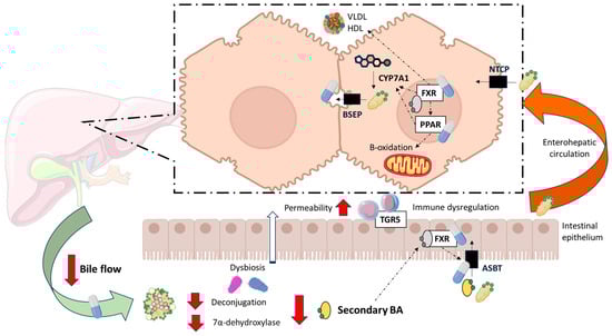 Alterations in bile acid and lipid metabolism in patients with Primary Biliary Cholangitis (PBC). Under physiological conditions, primary bile acids (BA) are synthesized in the liver from cholesterol. The cholesterol 7α-hydroxylase (CYP7A1) is the rate limiting enzyme. In the gut, primary BAs undergo deconjugation and 7α-dehydroxylation by anaerobic bacteria, resulting in the formation of secondary BA. In patients with PBC, bile flow from the liver to the intestinal lumen is reduced. There is also a reduction in deconjugation possibly associated with intestinal dysbiosis, increasing the primary to secondary BA ratio. As secondary BAs are the most potent agonists, its reduction could lead to dysregulation of Farnesoid X receptor (FXR) and G protein-coupled BA receptor (TGR5), increasing intestinal permeability and inflammatory responses. When FXR is dysregulated, homeostatic compensation of cholestasis cannot occur and therefore PBC progresses. Main pharmacological targets—FXR, Peroxisome Proliferator-Activated Receptors (PPARs), Apical Sodium-dependent Bile Acid Transporter (ASBT) and bile composition and flow—have been depicted. BSEP: Bile Salt Export Pump; HDL: High-Density Lipoprotein; NTCP: Na-Taurocholate Cotransporting Polypeptide. VLDL: Very-Low-Density Lipoprotein. Created with BioRender.com.