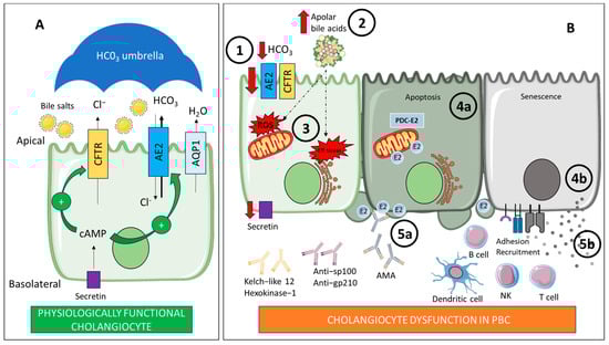 As mentioned before, once cholangiocytes are damage, they become active participants in disease progression. Importantly, PDC-E2 is overexpressed by stressed cholangiocytes, thus enhancing the autoimmune response and playing a crucial role in recruiting immune cells []. In fact, CD8+ T cells depend on AE2 to maintain the intracellular pH homeostasis []. Additionally, decreased expression of AE2 is correlated with dysregulated autophagy, expression of PDC-E2, and senescence [].