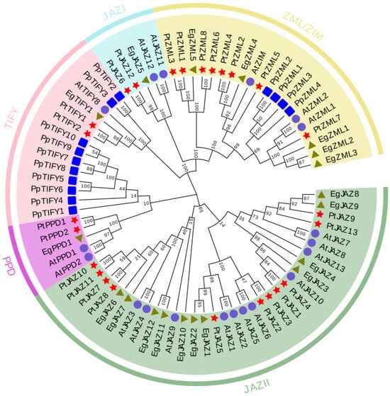 Phylogenetic tree of TIFY genes in E. grandis, P. trichocarpa, A. thaliana, and Physcomitrium patens. Symbols of different shapes represent TIFY genes from E. grandis (green triangles, Eg), A. thaliana (blue circles, At), P. trichocarpa (red stars, Pt), and P. patens standing bowl moss (blue squares, Pp). The neighbor-joining tree was constructed with 1000 bootstrap replicates.