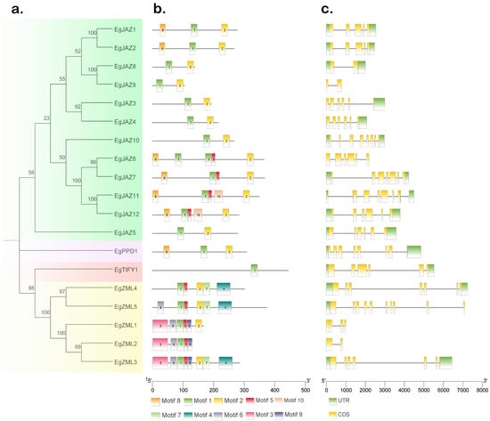 Analysis of conserved motifs and gene structure of EgTIFYs. (a) Neighbor-joining phylogenetic analysis (Bootstrap: 1000) of EgTIFYs proteins illustrating subfamily classifications, with four different colors representing four subfamilies: light green (JAZ), purple (PPD), red (TIFY), and yellow (ZML). (b) The different colored modules (Motif 1–Motif 10) represent the conserved amino acid sequence patterns in members of the gene family. (c) The intron and exon maps present the structural composition of the gene, with the yellow region representing the coding sequence (CDS) and the green region representing the untranslated region (UTR).