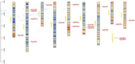 Chromosomal mapping analysis indicated that the 19 EgTIFY genes are dispersed across nine chromosomes (chromosomes 2, 3, 4, 5, 6, 7, 8, 10, and 11; Figure 3). Chromosome 3 harbored the highest number of EgTIFY genes (four: EgJAZ1, EgJAZ2, EgJAZ5, and EgTIFY1), followed by chromosomes 6 and 7, each containing three genes. Chromosome 8 carried two genes, while the remaining chromosomes each contained one. Notably, EgZML1 and EgZML2 were localized to the same scaffold and not anchored to any chromosome. Additionally, the EgTIFY genes were dispersed across chromosomes without forming clusters.