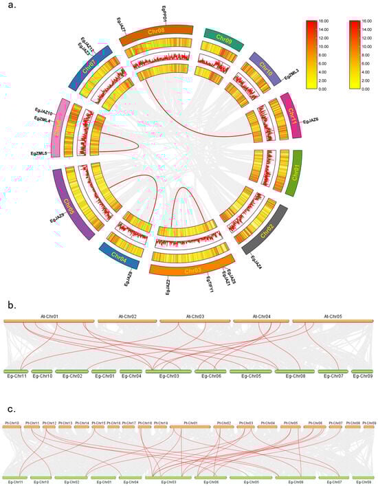 Collinearity profiles of TIFY family members across E. grandis, P. trichocarpa, and A. thaliana. Intraspecific collinear associations of TIFY family members in E. grandis (a). The three rings from inside to outside represent gene densities, presented as a heatmap and lines, respectively, and the rectangle in the upper right corner represents the gene density scale. The outermost ring represents the chromosome position. Gray lines represent all collinear blocks within the E. grandis genome, whereas red lines indicate segmental duplication events of EgTIFY genes. Additionally, interspecific collinear relationships are depicted between E. grandis and A. thaliana (b), and between E. grandis and P. trichocarpa (c). Red lines mark the duplication events of TIFY gene pairs.
