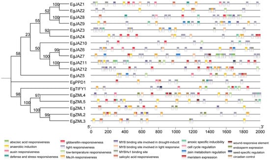 Prediction of cis-acting elements in the EgTIFYs. The 20 boxs on the lower side show the different cis-acting elements in the TIFY gene family promoters. The NJ tree was constructed 1000 bootstrap replicates.