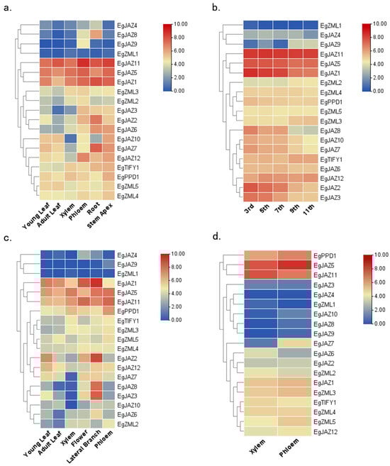To obtain a more profound understanding of the functional roles of TIFY genes in E. grandis, their expression patterns were examined using transcriptome data, and the accuracy of these expression levels was previously validated through quantitative real-time PCR experiments []. Expression levels of EgTIFY genes were evaluated across diverse tissues, including leaves, xylem, and phloem, of both 6-month-old and 3-year-old plants (Figure 6). The results revealed that EgTIFY gene expression is highly tissue- and stage-specific. Based on their expression patterns, the genes were categorized into three groups: constitutively expressed, lowly expressed, and stably expressed. Constitutively expressed genes, such as EgJAZ1, EgJAZ5, and EgJAZ11, exhibited consistently high expression across all tissues and developmental stages (Figure 6). In contrast, genes including EgZML1, EgJAZ9, and EgJAZ4 exhibited low expression in all sampled tissues, suggesting limited or specialized roles under normal physiological conditions. Meanwhile, stably expressed genes like EgZML3 and EgZML4 maintained relatively constant expression levels between the two developmental stages, indicating a role in maintaining basic cellular functions (Figure 6a,c). Among all genes, EgJAZ11 and EgJAZ5 showed particularly high expression in xylem and phloem tissues, suggesting a possible role in regulating secondary cell wall formation and vascular development in E. grandis (Figure 6b). Conversely, the consistently low expression levels of EgJAZ4, EgJAZ9, and EgZML1 across tissues may indicate a reduced functional demand or tightly regulated activity under standard growth conditions. Overall, these expression profiles provide meaningful elucidations regarding the tissue-specific and developmental roles of EgTIFY genes in E. grandis physiology.