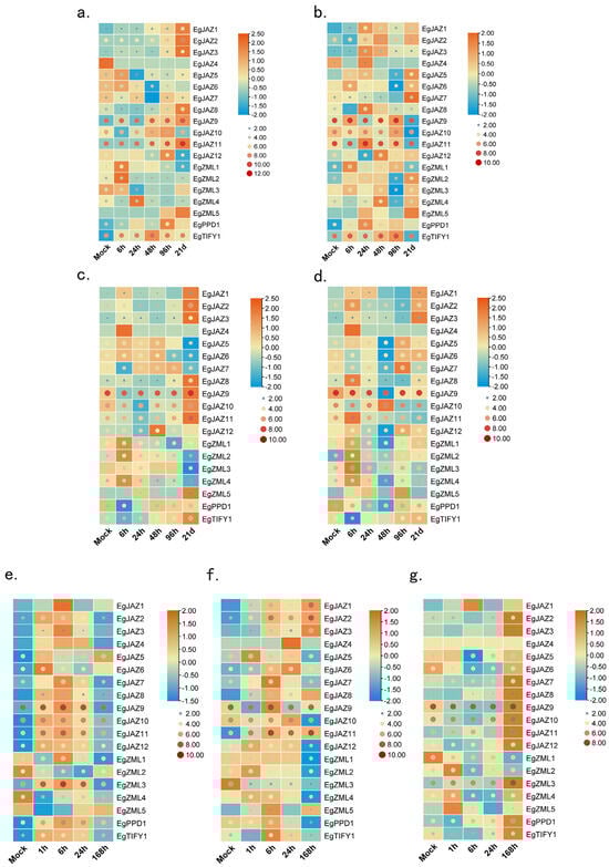 Gene expression of EgTIFY genes under abiotic stress and hormone treatments. (a–d) Expression pattern of EgTIFY genes under boron deficiency (a,c) and phosphorus deficiency treatment (b,d) after 0 h, 6 h, 24 h, 48 h, 96 h, and 21 d. The root (a,b) and stems (c,d) were used as samples. (e–g) Expression levels of EgTIFY genes at 0 h, 1 h, 6 h, 24 h, and 168 h under JA treatment (e), salt stress (f), and SA treatment (g). Transcript abundance is represented using a blue-to-red gradient, corresponding to log2-normalized RNA-Seq expression values (low to high). The color and size of the circles correlate with raw EgTIFY expression values: larger, redder circles reflect higher expression magnitudes, whereas smaller, bluer circles indicate lower magnitudes. Rectangular plots are row-normalized, with blue representing lower expression at each processing length and deeper orange indicating higher expression at the same length.