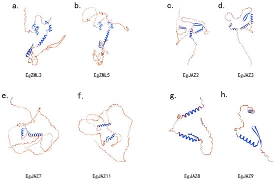 Three-dimensional structural analysis of EgTIFY gene family members. (a,b) Three-dimensional structure of EgZML3 and EgZML5, belonging to the ZML protein subfamily. (c,d) Three-dimensional structure of EgJAZ2 and EgJAZ3 from the JAZ protein subfamily. (e,f) Three-dimensional structure of EgJAZ7 and EgJAZ11 from the JAZ protein subfamily. (g,h) Three-dimensional structure of EgJAZ8 and EgJAZ9, member sof the JAZ protein subfamily.