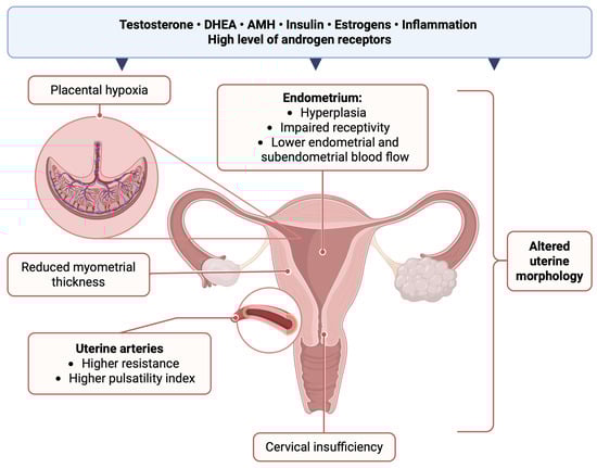 Uterine changes potentially associated with PCOS. Possible influencing factors include elevated levels of testosterone, DHEA, AMH, insulin, estrogens, associated inflammation, and high levels of androgen receptors. DHEA—Dehydroepiandrosterone; AMH—Anti-Müllerian Hormone. Created with BioRender (2025).