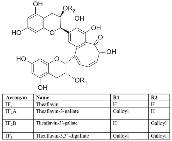 Theaflavins (TFs) are among the major components of black tea, accounting for approximately 2–6% of its dry weight. These orange pigments are responsible for the tea’s bitter, strong flavour and dark colour [1]. Due to their biological and therapeutic properties, theaflavins are often referred to as “golden molecules” [12]. Theaflavins are formed through a process catalysed by polyphenol oxidase (PPO) and peroxidase (POD), involving the dimerization of epicatechins found in green tea: epicatechin (EC), epigallocatechin (EGC), epicatechin gallate (ECG) and epigallocatechin gallate (EGCG). In black tea, four main types of theaflavins can be identified: theaflavin (TF1 formed from EC and EGC), theaflavin-3-gallate (TF2A, ECG and EGC), theaflavin-3′-gallate (TF2B, EC and EGCG) and theaflavin-3,3′-gallate (TF3, ECG and EGCG) [2,13] (Figure 1).