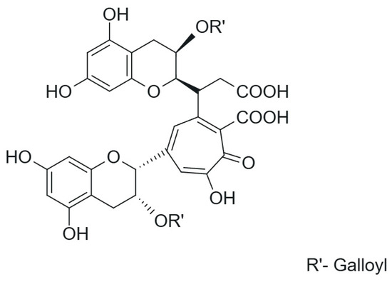 Unlike TFs, which have been well characterised and described over the years, the exact properties and characteristics of thearubigins (TRs) still require further analysis. A major challenge is that TRs are very difficult to isolate under laboratory conditions. It is known that TRs comprise a mixture of substances with molecular weights ranging from 1000 to 40,000 [35]. The TR content in black tea is higher than that of TF, at approximately 12–16%, making them the most abundant group of compounds in black tea [1,13]. They are characterised with a red-brown or dark brown colour and are believed to be responsible for the red-brown appearance of tea and its “heavy” taste [36]. TRs are formed during the PPO- and POD-catalysed oxidation of TFs and catechins [37]. It is hypothesised that they are heterogeneous flavan-3-ols and their gallate derivatives (Figure 2).