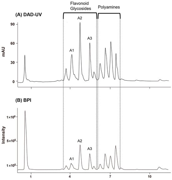 (A) DAD–UV chromatograms of Quercus mongolica pollen at 254 nm. (B) Base peak ion chromatogram (BPI) with reference compounds A1–A3. Peaks observed at 3.48–5.96 min were identified as flavonoid glycosides, while those at 6.01–7.68 min corresponded to polyamines.