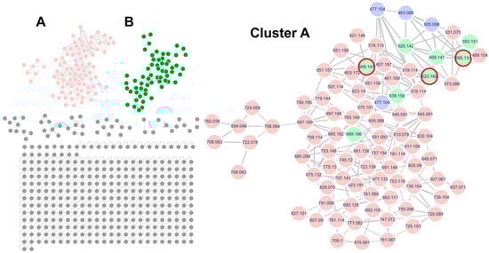 The MS/MS spectral molecular network of Quercus mongolica pollen in negative ion mode and the molecular family of flavonoid glycosides showing the molecular families of Cluster (A) (flavonoid glycosides, pink), Cluster (B) (polyamines, green). In Cluster (A), purple nodes, green nodes, and red circles represent flavonoid monoglycosides matched with the GNPS spectral library, flavonoid diglycosides, and reference compounds identified in Q. mongolica pollen, respectively.
