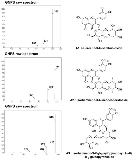 Raw MS/MS spectra of primary compounds (A1, A2, and A3) from Quercus mongolica pollen obtained from GNPS. Quercetin 3-O-sambubioside (A1, compound 6; RT = 4.17 min; [M−H]− m/z 595.132), isorhamnetin 3-O-neohesperidoside (A2, compound 30; RT = 4.75 min; [M−H]− m/z 623.165), isorhamnetin 3-O-β-D-xylopyranosyl(1→6)-β-D-glucopyranoside (A3, compound 28; RT = 5.47 min; [M−H]− m/z 609.165).