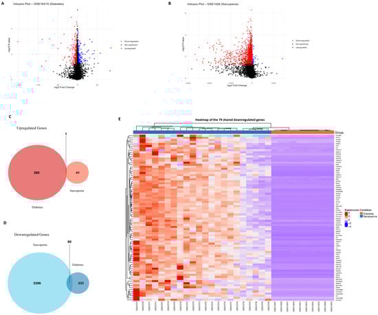 Identification of DEGs in diabetes and sarcopenia. (A) Volcano plot of the GSE16415 dataset (diabetes), with upregulated and downregulated DEGs highlighted similarly. (B) Volcano plot of the GSE1428 dataset (sarcopenia) showing significantly upregulated (red) and downregulated (blue) genes with a log2 fold change ≥ 0.5 and an adjusted p-value < 0.05. (C) Venn diagram showing the number of overlapping upregulated genes between the two datasets. One shared upregulated gene (NNMT) was identified. (D) Venn diagram illustrating the 79 downregulated DEGs shared by both sarcopenia and diabetes datasets. (E) Heatmap of shared DEGs between sarcopenia and diabetes datasets, illustrating consistent downregulation across conditions. Together, these visualizations support the identification of a common metabolic and mitochondrial dysfunction pattern underlying both diabetes and sarcopenia.