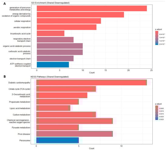 The GO enrichment analysis of the downregulated DEGs shared between sarcopenia and diabetes revealed a significant enrichment in biological processes related to mitochondrial function and energy metabolism. Specifically, the most enriched terms included the generation of precursor metabolites and energy, cellular respiration, aerobic respiration, and the tricarboxylic acid cycle, highlighting a common mitochondrial dysfunction signature. Furthermore, processes such as ATP synthesis-coupled electron transport and the respiratory electron transport chain were significantly represented, reinforcing the hypothesis of impaired oxidative phosphorylation (Figure 2A).