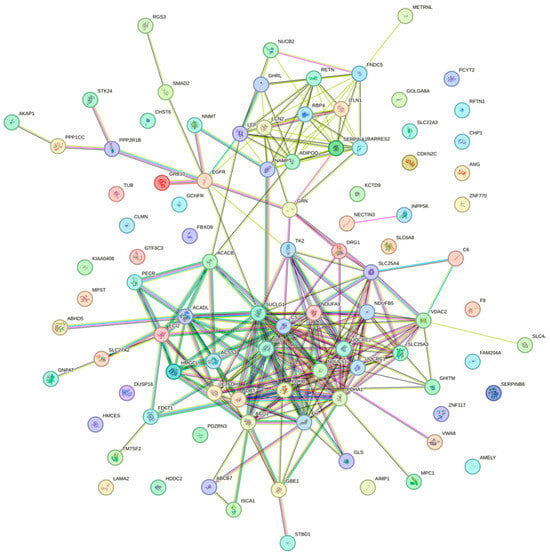 - Szklarczyk, D.; Kirsch, R.; Koutrouli, M.; Nastou, K.; Mehryary, F.; Hachilif, R.; Gable, A.L.; Fang, T.; Doncheva, N.T.; Pyysalo, S.; et al. The STRING database in 2023: Protein-protein association networks and functional enrichment analyses for any sequenced genome of interest. Nucleic Acids Res. 2023, 51, D638–D646. [Google Scholar] [CrossRef] [PubMed]