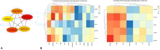 (A) The protein interaction network obtained by analyzing PPI with the Cytoscape plugin MCODE, representing the sub-modules obtained using the MCODE plugin. (B) Correlation between hub genes and target genes in GSE1428 (left) and GSE16415 (right). The heatmaps show the strength of correlations between genes, with positive correlations indicated by red and negative correlations by blue, highlighting the diverse relationships between metabolic and inflammatory genes in the datasets.