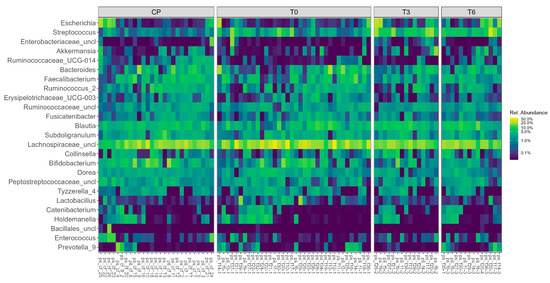 Notably, genera such as Bacteroides, Akkermansia, Bifidobacterium, Faecalibacterium, and Prevotella were consistently present across multiple samples, though with varying levels of abundance. Some phyla, including Collinsella, Dorea, and Lactobacillus, showed pronounced variability between individuals. The heatmap reveals clear inter-individual differences in the microbiota composition, which may be associated with clinical or procedural factors.
