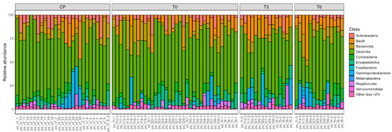 Class-level microbial composition of the analyzed samples, grouped by sampling time.