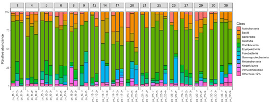 Class-level microbial composition of the analyzed samples, grouped by patient. Only samples with more than one time point were included in this representation.