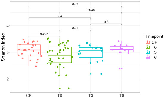 Shannon index as a measure of alpha diversity in normal-weight controls (CP) and patients at preoperative (T0), 3-month (T3), and 6-month (T6) time points. Group comparisons are indicated by brackets, with corresponding p-values displayed above. Statistical significance was considered for p < 0.05.