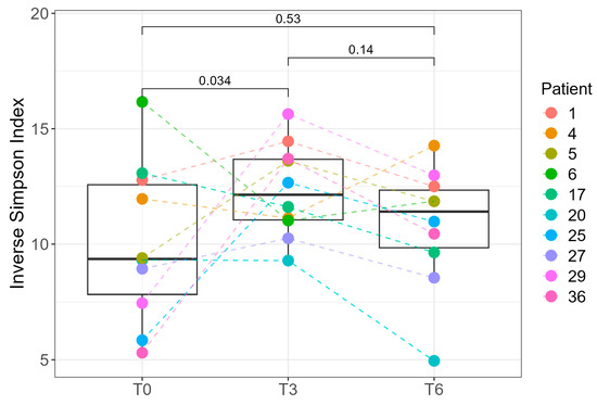 Inverse Simpson index as a measure of alpha diversity in patients at preoperative (T0), 3-month (T3), and 6-month (T6) time points. Comparisons are marked with brackets and p-values above. p < 0.05 was considered statistically significant. Samples are color-coded by patient, and dotted lines represent the temporal trend of the index for each individual.