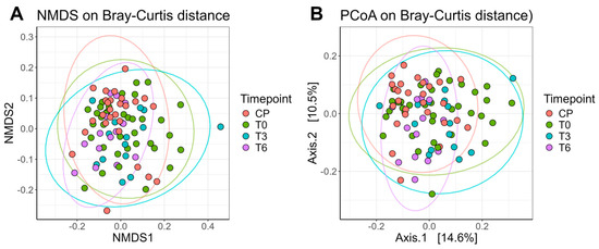 Nonphylogenetic alpha-diversity indices were calculated with the phyloseq v1.38 package. The Bray–Curtis dissimilarity matrix was constructed using phyloseq, starting from data transformed via variance-stabilizing transformation. Two-dimensional reduction methods were used: NMDS (non-metric multidimensional scaling) and PCoA (principal coordinates analysis).