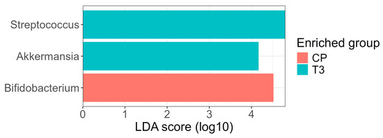 Differential abundance analysis using the LEfSe method identified three genera with LDA ≥ 4.0 showing significant differences between groups (Figure 7). At the three-month postoperative time point (T3), the genera Streptococcus and Akkermansia were enriched, whereas the genus Bifidobacterium was enriched in the control (normal-weight) group. The increase in Akkermansia at T3 is noteworthy given its recognized role in maintaining mucosal integrity, modulating inflammation, and improving glucose metabolism; previous studies have reported an expansion of Akkermansia muciniphila following RYGB surgery [17]. Bifidobacterium, a commensal genus often associated with metabolic health and dietary fiber fermentation, was more abundant in the control group, consistent with its frequent reduction in individuals with obesity and its reported recovery after interventions promoting metabolic balance.