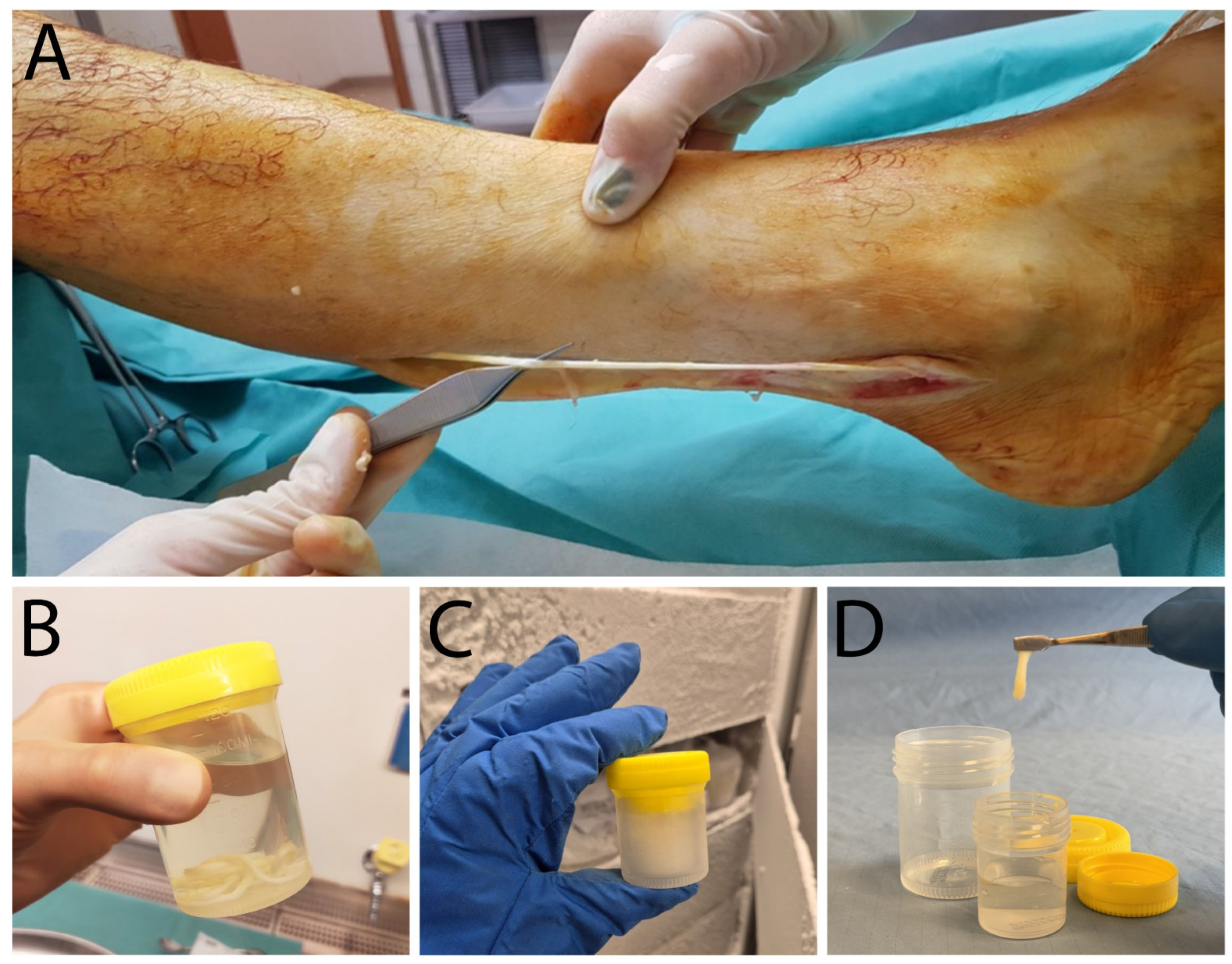 - Italian National Transplant Center. Linee Guida per Il Prelievo, la Processazione e la Distribuzione di Tessuti a Scopo di Trapianto. Available online: https://www.trapianti.salute.gov.it/trapianti/archivioProtocolliCnt.jsp?lingua=italiano&anno=2013&btnCerca=cerca (accessed on 28 May 2025).