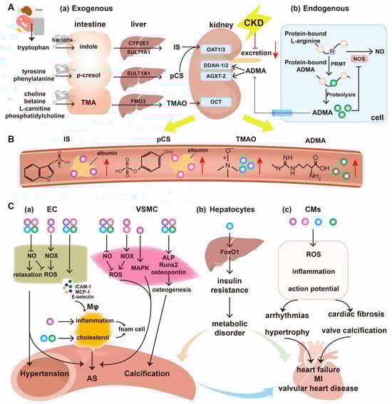The metabolism and cardiovascular toxicity of uremic toxins. (A). The production and excretion of uremic toxins. (a) Exogenous gut-derived uremic toxins. Dietary tryptophan is converted into indole by gut bacteria in the intestine, subsequently absorbed, and transported into the liver, where it is catalyzed by cytochrome P450 2E1 (CYP2E1) and sulfotransferase 1A1 (SULT1A1) to generate indoxyl sulfate (IS). P-cresyl sulfate (pCS) originates from dietary tyrosine and phenylalanine, which are metabolized to p-cresol in the intestine by gut bacteria, sulfated by SULT1A1 in the liver, and eventually converted to pCS. Dietary precursors, including phosphatidylcholine, choline, betaine, and L-carnitine, generate trimethylamine (TMA) by bacteria, which is further oxidized by flavin monooxygenase isoform 3 (FMO3) in the liver to form trimethylamine N-oxide (TMAO). The exogenous toxins from foods are excreted in the kidney by organic anion transporters 1/3 (OAT1/3, mediating IS and pCS) and organic cation transporter (OCT, mediating TMAO). (b) The endogenous production of uremic toxins. Asymmetric dimethylarginine (ADMA) is produced by protein arginine methyltransferases (PRMT), which methylate the L-arginine in proteins post-translationally and release it after proteolysis. ADMA is metabolized through dimethylarginine-dimethylaminohydrolase-1/2 (DDAH1/2) and alanine glyoxylate aminotransferase 2 (AGXT2) and excreted in the kidney. Under CKD, the excretion of toxins is reduced, leading to increased levels of uremic toxins in the circulation. (B). Structural and circulating forms of IS, pCS, TMAO, and ADMA. IS and pCS are bound to albumins in circulation with high affinity. (C). The cardiovascular toxicity of uremic toxins. (a) Vascular toxicity. In endothelial cells (ECs), the four toxins all decrease NO production and increase the expression of inflammatory cytokines and selectins, resulting in reactive oxygen species (ROS) production, decreased relaxation, and inflammation. In addition, IS and pCS upregulate NADPH oxidase (NOX) expression to increase ROS. In vascular smooth muscle cells (VSMCs), the four toxins similarly increase ROS production as in ECs. Moreover, the four toxins upregulate the expression of osteogenic runt-related transcription factor 2 (Runx2), alkaline phosphatase (ALP), and osteopontin, promoting vascular calcification. In macrophages (Mφ), IS increases the inflammation level, while TMAO and ADMA increase cholesterol accumulation, both promoting the formation of foam cells. The pro-oxidant, pro-inflammatory, and osteogenic effects of the four toxins contribute to the development of hypertension, atherosclerosis, and calcification. (b) Metabolic toxicity. Liver-synthesized TMAO upregulates the expression of forkhead box protein O1 (FoxO1) and aggravates insulin resistance and metabolic disorder. (c) Cardiac toxicity. The four toxins increase the ROS production and inflammation in cardiomyocytes (CMs), prolong the action potential duration, and induce early afterdepolarization, all of which result in cardiac arrhythmias, hypertrophy, fibrosis, and valve calcification, leading to heart failure, myocardial infarction (MI), and valvular heart disease. The vascular, metabolic, and cardiac toxicities aggravate each other via positive feedback, promoting the development of cardiovascular diseases. Red arrows: increased levels of uremic toxins. Purple circles: IS. Pink circles: pCS. Blue circles: TMAO. Green circles: ADMA.