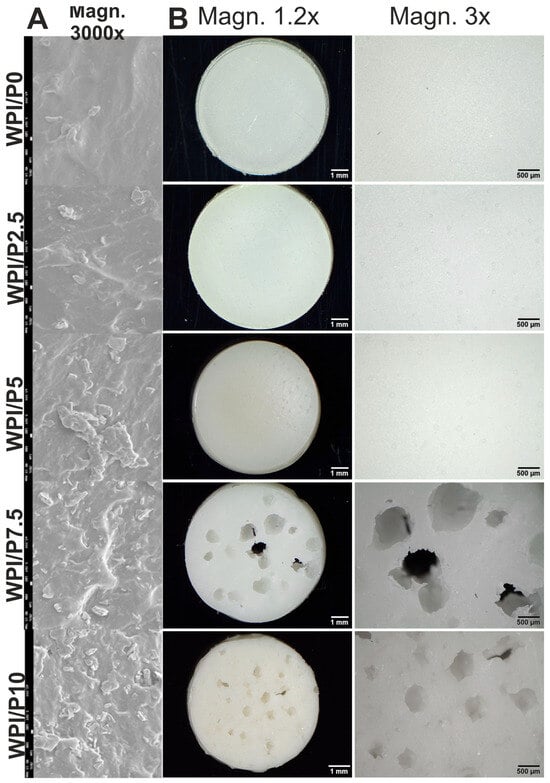Scanning electron microscopy (SEM) analysis (Figure 1A) revealed that the number of visible precipitates on the surfaces of biomaterials increased with increasing percentage of pearl powder. Furthermore, stereoscopic microscope observations (Figure 1B) showed that the surface of the biomaterial without pearl powder (WPI/P0) and the surfaces of biomaterials containing small amounts of such powder (WPI/P2.5 and WPI/P5) did not have visible pores. However, in the case of the biomaterials with the highest pearl powder content (WPI/P7.5 and WPI/P10), visible pores were observed, giving the biomaterials a morphology reminiscent of “Swiss cheese”. The reason for this phenomenon is unclear, but it may be related to the heating of pearl powder. Heating pearl powder, which primarily contains CaCO3, can lead to the decomposition of CaCO3 and the release of carbon dioxide (CO2) gas in a process called calcinations [43]. It is well known that CO2 is considered one of the most popular porogens used in biomaterials engineering [44,45]. Therefore, in WPI/P7.5 and WPI/P10 biomaterials, the amount of CaCO3 had to be large enough to create visible pores. The presence of pores is very beneficial for the future fate of bone scaffolds. It has been recommended that bone scaffolds should have pores of at least 100 µm, which are necessary for cell growth and proliferation, while pores above 300 µm are crucial for angiogenesis and the growth of new bone tissue [15,46,47]. Interestingly, in our previous works, Dziadek et al. noticed that pores occurred in WPI hydrogels after the addition of bioactive glass particles [42], while Gupta et al. observed pore formation in WPI hydrogels after the addition of aragonite particles [48].