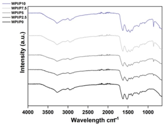 FTIR analysis of the WPI/Pearl hydrogels (intensity in arbitrary units (a.u.) with wavenumber). The samples increase in pearl concentration in an ascending order, with the WPI/P0 control, with no pearl powder (black) at the bottom.