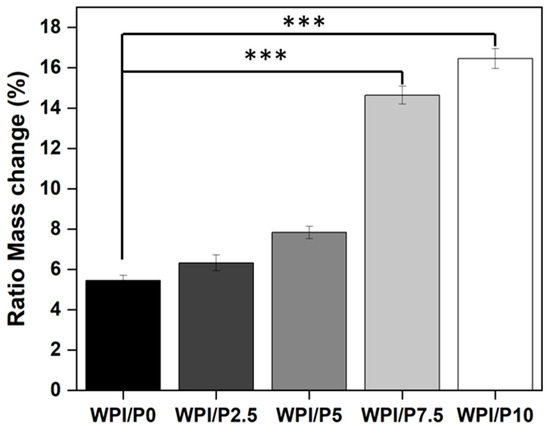 The ability to swell can be a desirable property of a scaffold due to an increase in pore size, due to stretching of the bonds, which provides an increase in internal surface area for cellular attachment. Additionally, the increasing solute uptake may conceivably favor cell nourishment. Increasing pearl concentration led to increasing swelling potential compared to the WPI/P0 base biomaterial (Figure 3). For instance, the swelling percentage increased from 5.45% for the WPI/P0 base biomaterial to 6.33% for WPI/P2.5., to 7.83% for the WPI/P5 group, to 14.64% for the WPI/P7.5 variable, and to 16.45% for the WPI/P10 sample groups. The WPI/P7.5 and the WPI/P10 demonstrated significant differences (p < 0.001) when compared to the WPI base biomaterial.