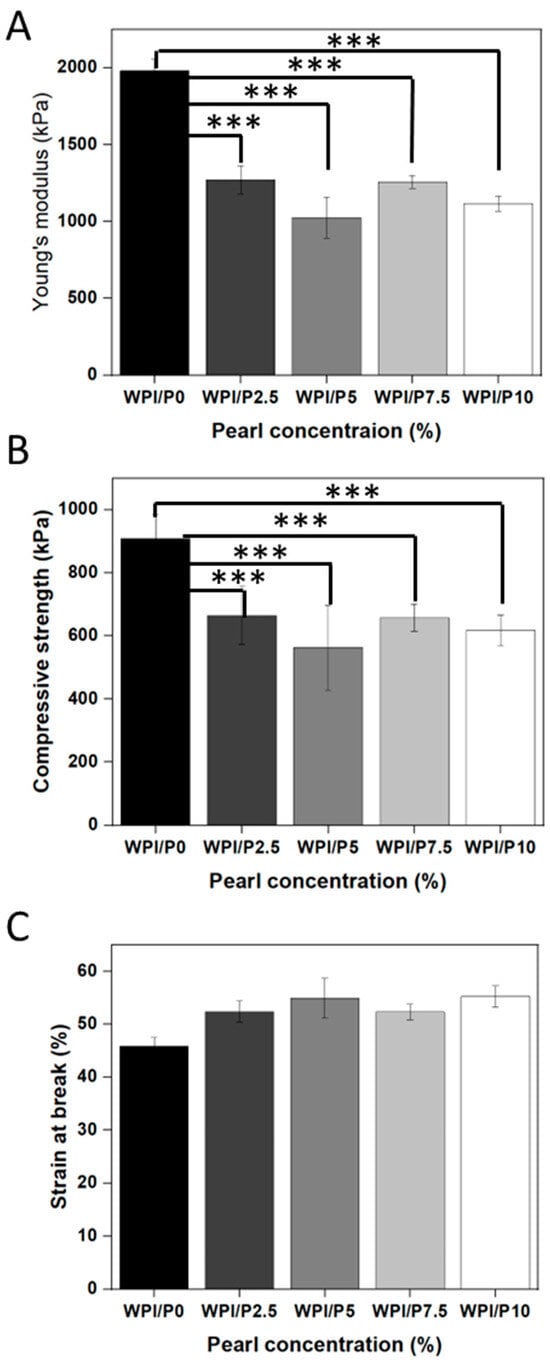 The results of the mechanical testing for the WPI/Pearl hydrogel. The Young’s modulus (A), the compressive strength (B), and the strain at break (C) were analyzed for each concentration sample group. Each bar represents the mean ± SD of n = 5. *** p < 0.001–statistically significant results compared to the WPI/P0 base biomaterial (unpaired Student t-test, GraphPad Prism 10, Version 10.4.1 Software).