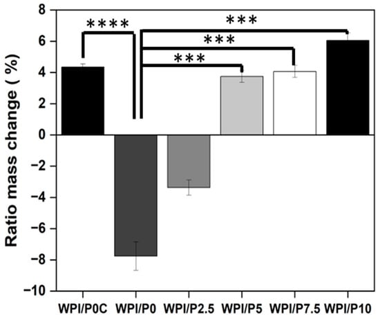 The results of the enzymatic degradation of the WPI/Pearl hydrogel samples. The samples were incubated at pH 7 with proteases for 5 days. The WPI0C sample group is a control without enzymes, whereas the WPI0 is the 40% WPI hydrogel control with enzymes in the solution. Each bar represents the mean ± SD of n = 10 (*** p < 0.001, **** p < 0.0001) compared to the WPI/P0C, one-way ANOVA, followed by Tukey’s multiple comparison test, GraphPad Prism 10, Version 10.4.1 Software).