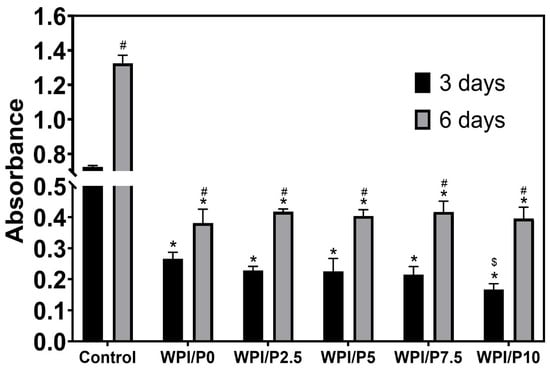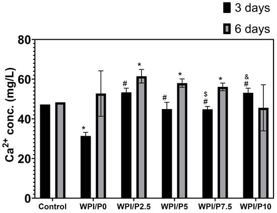 The ability of biomaterials to absorb or release calcium ions over time. During the experiment, liquid extracts from biomaterials (n = 4) were harvested on day 3, and then a new portion of culture medium was added. The extracts were taken once again on day 6. *-Statistically significant difference compared to the control extract–culture medium incubated without biomaterials and collected at the specified time point; #-statistically significant difference compared to the extract from base biomaterial (WPI/P0), collected at the specified time point; $-statistically significant difference to the extract from WPI/P2.5 biomaterial, collected at the specified time point; &-statistically significant difference compared to the extract from WPI/P7.5 biomaterial, collected at the specified time point. Two-way ANOVA, followed by Bonferroni comparison test, p < 0.05, GraphPad Prism 10, Version 10.4.1 Software.
