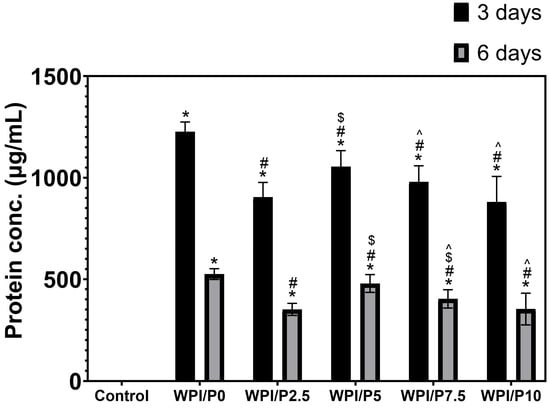 The ability of biomaterials to release protein over time. During the experiment, liquid extracts from biomaterials (n = 4) were harvested on day 3, and then a new portion of culture medium was added. The extracts were taken once again on day 6. *-Statistically significant difference compared to the control extract–culture medium incubated without biomaterials and collected at the specified time point; #-statistically significant difference compared to the extract from base biomaterial (WPI/P0), collected at the specified time point; $-statistically significant difference to the extract from WPI/P2.5 biomaterial, collected at the specified time point; ^-statistically significant difference compared to the extract from WPI/P5 biomaterial, collected at the specified time point. Two-way ANOVA, followed by Bonferroni comparison test, p < 0.05, GraphPad Prism 10, Version 10.4.1 Software).