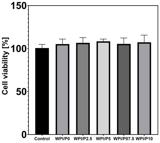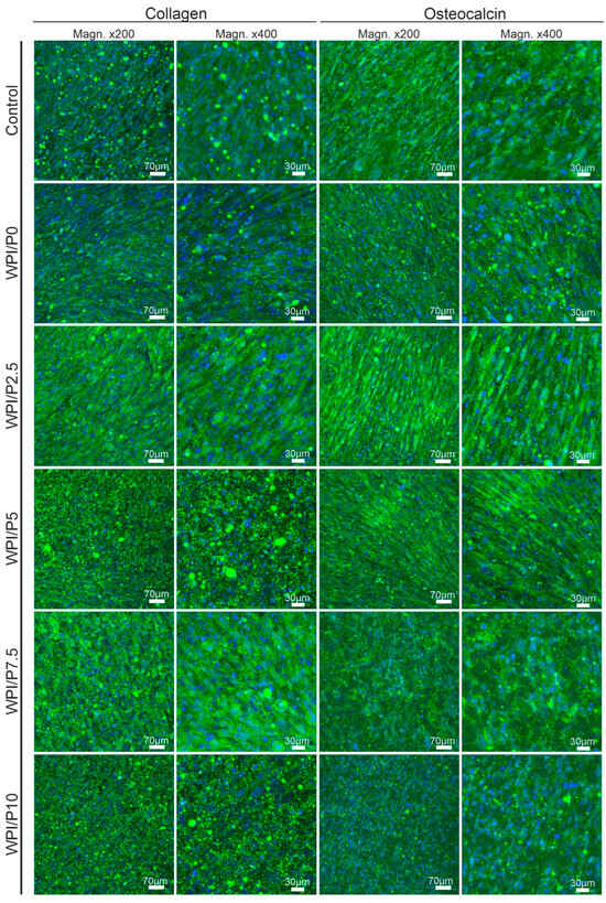 Differential staining of live and dead cells (Figure 9) demonstrated that the surfaces of all tested biomaterials supported osteoblast colonization and growth. Similar to cells cultured on polystyrene (control), cells cultivated on biomaterials exhibited very high viability, as evidenced by visible green fluorescence. Hence, these observations showed that the surfaces of the fabricated biomaterials were safe and beneficial for cell growth. It should be emphasized that these results were expected, as both WPI-based biomaterials and pearl powder have the ability to enhance cell growth [23,36,37,61].