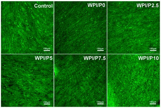 Viability of normal human osteoblasts growing on control biomaterials–polystyrene and tested biomaterials composed of WPI without or with pearl powder (WPI/P0 and WPI/P2.5; WPI/P5; WPI/P7.5; WPI/P10, respectively). After 48 h of incubation, cells were differentially stained using the Live/Dead Double Cell Staining Kit and observed using a confocal laser scanning microscope (CLSM). Only living cells were observed, which emitted green fluorescence (if dead cells were present, they would emit red fluorescence). Magnification = 100×, bar scale = 150 μm.