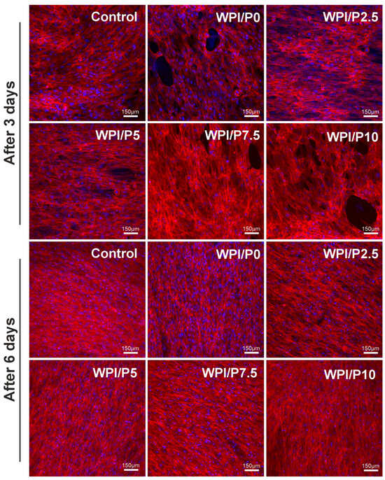 The WST-8 test (Figure 10) demonstrated that all tested biomaterials (control and WPI-based) promoted cell proliferation over time, as the OD values were higher with increasing incubation time. Unfortunately, no significant differences (p > 0.05) were found between biomaterials containing WPI and pearl powder, which was somewhat surprising, as a higher powder content was expected to favorably influence cell division. Microscopic observations (Figure 11) performed after fluorescent staining of cell nuclei and actin filaments of the cytoskeleton showed that the surfaces of all biomaterials were favorable for osteoblast division over time. At the end of the experiment (on day 6), a monolayer of cells with normal morphology was observed. Therefore, this experiment demonstrated that all tested biomaterials similarly promoted osteoblast division over time. According to the literature data, both WPI and pearl powder have the ability to enhance cell proliferation [19,28,48]. Perhaps it would be worth considering increasing the pearl powder content in WPI-based biomaterials to observe an enhanced effect.