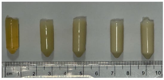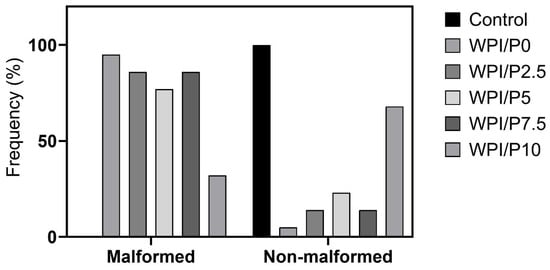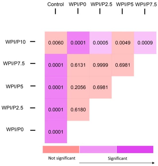 Previously, the WPI hydrogel has demonstrated Young’s modulus values of approximately 2000 kPa [42,48,52]. The WPI/P0 base in this aligns with previous WPI mechanical analyses.