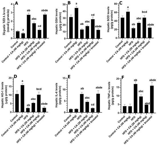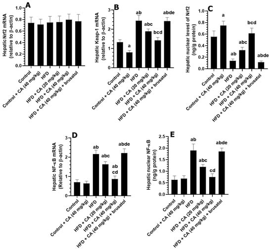 | Parameter | Control | Control + CA (40 mg/kg) | HFD | HFD + CA (20 mg/kg) | HFD + CA (40 mg/kg) | HFD + CA (40 mg/kg) + Brusatol |