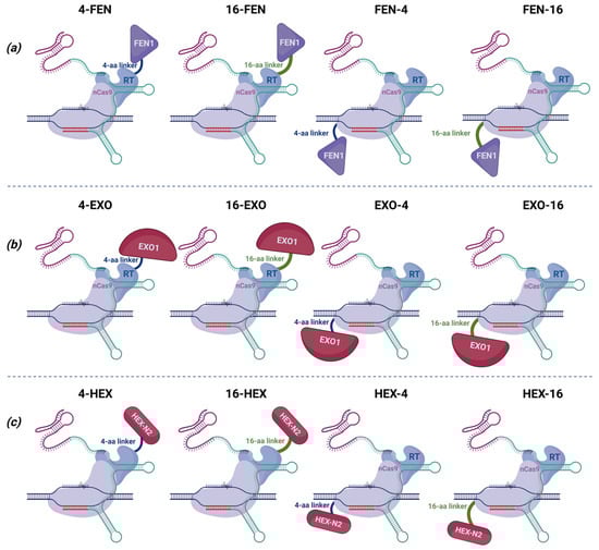 - Truong, D.-J.J.; Geilenkeuser, J.; Wendel, S.V.; Wilming, J.C.H.; Armbrust, N.; Binder, E.M.H.; Santl, T.H.; Siebenhaar, A.; Gruber, C.; Phlairaharn, T.; et al. Exonuclease-enhanced prime editors. Nat. Methods 2024, 21, 455–464. [Google Scholar] [CrossRef]