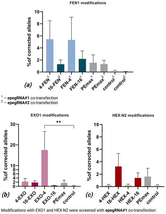 APA StyleVolodina, O. V., Demchenko, A. G., Anuchina, A. A., Ryzhkova, O. P., Kovalskaya, V. A., Kondrateva, E. V., Artemova, E. V., Tabakov, V. Y., Ignatov, M. A., Vorobyeva, N. Y., Osipov, A. N., Lavrov, A. V., & Smirnikhina, S. A. (2025). Prime Editing Modification with FEN1 Improves F508del Variant Editing in the CFTR Gene in Airway Basal Cells. International Journal of Molecular Sciences, 26(16), 7943. https://doi.org/10.3390/ijms26167943
