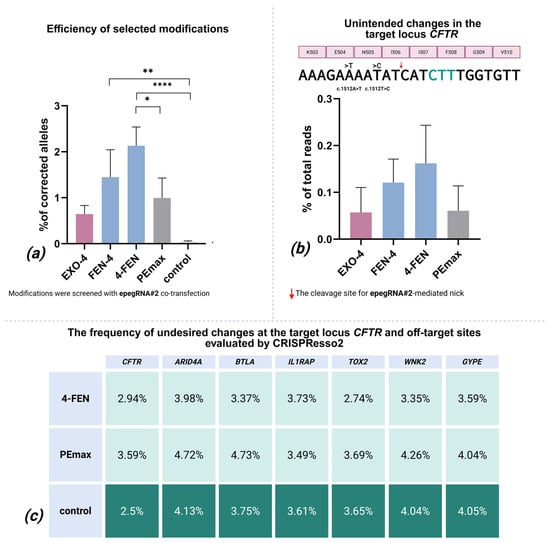 Volodina, O.V.; Demchenko, A.G.; Anuchina, A.A.; Ryzhkova, O.P.; Kovalskaya, V.A.; Kondrateva, E.V.; Artemova, E.V.; Tabakov, V.Y.; Ignatov, M.A.; Vorobyeva, N.Y.; et al. Prime Editing Modification with FEN1 Improves F508del Variant Editing in the CFTR Gene in Airway Basal Cells. Int. J. Mol. Sci. 2025, 26, 7943. https://doi.org/10.3390/ijms26167943
