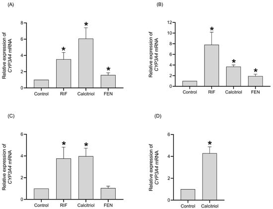 Effect of RIF, calcitriol, and FEN on CYP3A4 mRNA levels in HepG2 cells after 24 h (A), 48 h (B), 72 h (C), and 96 h (D) of treatment. HepG2 cells were treated with 0.05% DMSO (control), 10 µM RIF, 0.25 µM calcitriol, and 250 µM FEN. The relative expression of CYP3A4 mRNA was determined by real-time PCR and normalized to the GAPDH mRNA levels. The results are expressed as the mean ± standard deviation (SD) of three independent experiments in duplicate. The p values were calculated using the Mann–Whitney U test (* p < 0.05 vs. control).