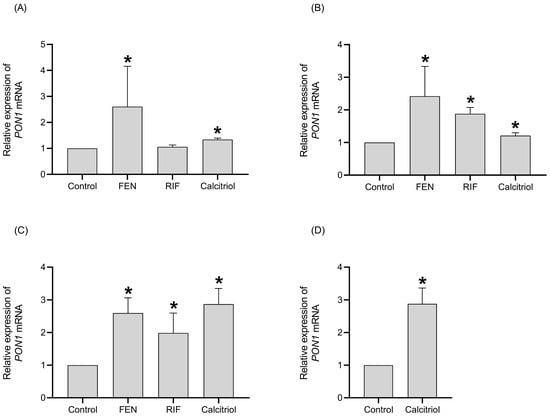 Effect of FEN, RIF, and calcitriol on PON1 mRNA levels in HepG2 cells after 24 h (A), 48 h (B), 72 h (C), and 96 h (D) of treatment. HepG2 cells were treated with 0.05% DMSO (control), 250 µM FEN, 10 µM RIF, and 0.25 µM calcitriol. The relative expression of PON1 mRNA was determined by real-time PCR and normalized to the 18S mRNA levels. The results are expressed as the mean ± standard deviation (SD) of three independent experiments in duplicate. The p values were calculated using the Mann–Whitney U test (* p < 0.05 vs. control).